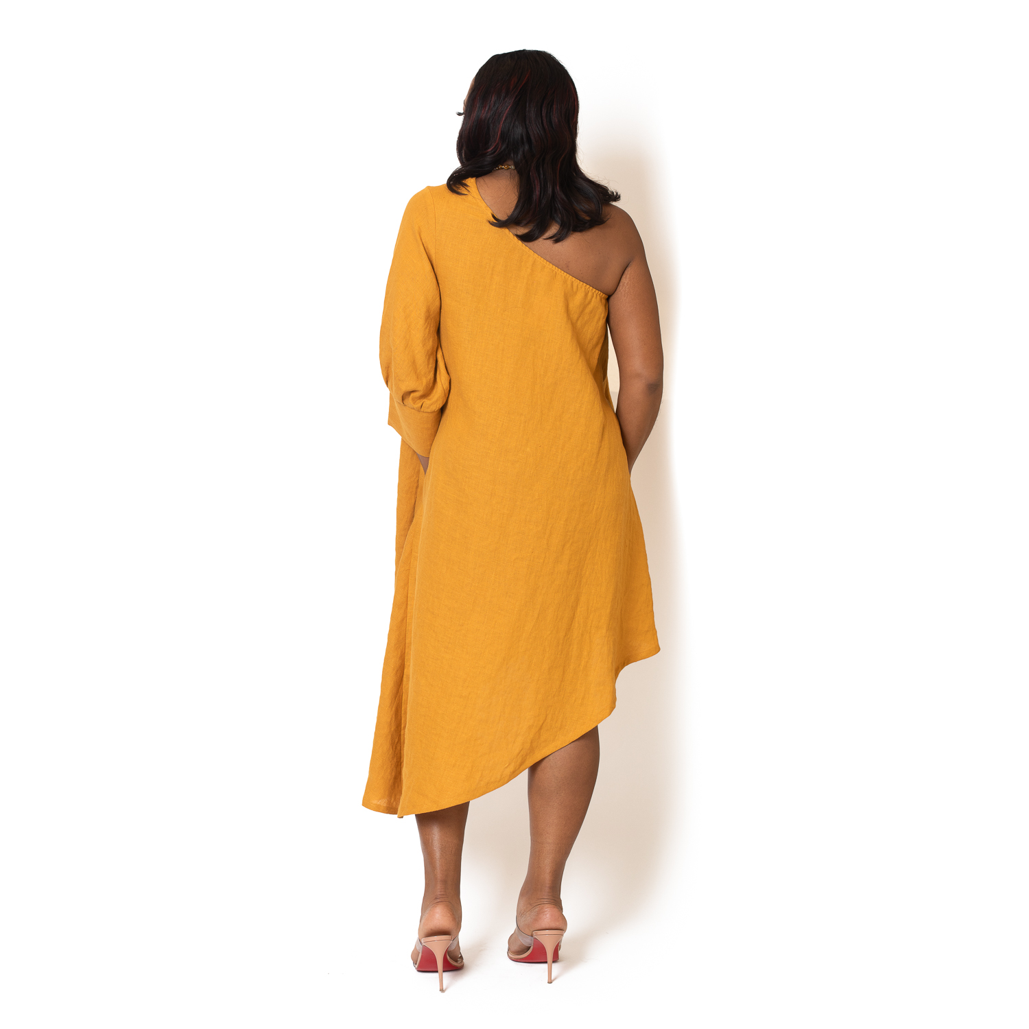Turn heads in this striking, flowing one shoulder linen dress! Featuring functional pockets and a figure flattering asymmetrical hemline. A must have for fashion forward women who love chic lines. Ideal dress for entertaining, gatherings and dressier events. Stand out in Style and confidence as you gracefully walk into rooms.